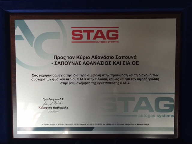 H STAG autogas systems απένειμε τιμητική πλακέτα στον Σαπουνά Αθανάσιο για την συνεισφορά του στην προώθηση και την διανομή των συστημάτων φυσικού αερίου STAG στην Ελλάδα, καθώς και για την υψηλή γνώση στη βαθμονόμηση της εγκατάστασης STAG.